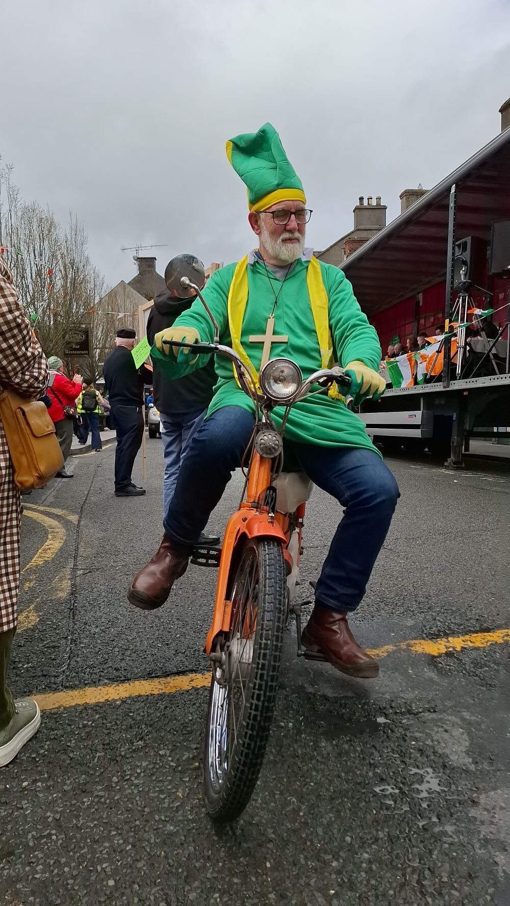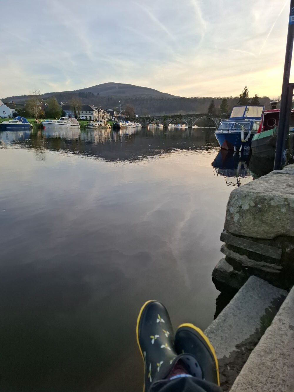 Da Snoopy und ich auf unbestimmte Zeit, den Campingplatz fahrenderweise nicht verlassen konnten, erkundeten wir weiträumig die Umgebung. Der liebevoll gepflegte Ort liegt am Fluss Barrow mit einem kleinen Hafen, umgeben von Wald und Feldern. Beim genauen Betrachten des Dorfes selbst stellte ich aber fest, dass fast jedes Geschäft leer stand. Einige Gebäude sind mit Beispielfolien (Schaufenster eines Buchladens) beklebt, die zumindest eine andere Atmosphäre suggerieren. Es gab lediglich noch einige Pubs, Bistros und mehrere Supermärkte. Das Zentrum ist die Kirche. Ich erfuhr, dass selbst die Supermärkte zur Coronazeit kurz vor dem Aus standen. Den Umschwung brachte die explodierende Wohnmobilkultur in dieser Zeit. Auf dem Grundstück des Outdoorladens direkt am Fluss entstand der Campingplatz Barrow Valley Activities Hub, der jährlich größer und komfortabler wurde. Durch ihn blüht der Ort wieder auf. Das Team organisiert viele Livekonzerte auf dem Platz, die St. Patricks Day Parade und stellt auch einen kleinen Raum für Veranstaltungen oder Yogagruppen zur Verfügung. Die Touristen sind wieder da und bringen die Wirtschaft so langsam wieder in Gang.
