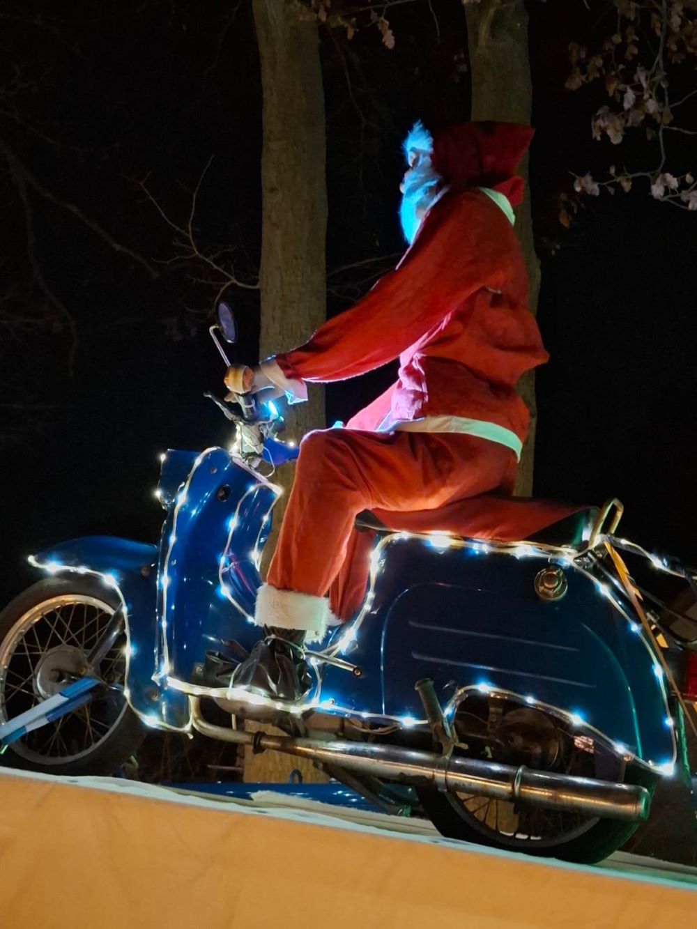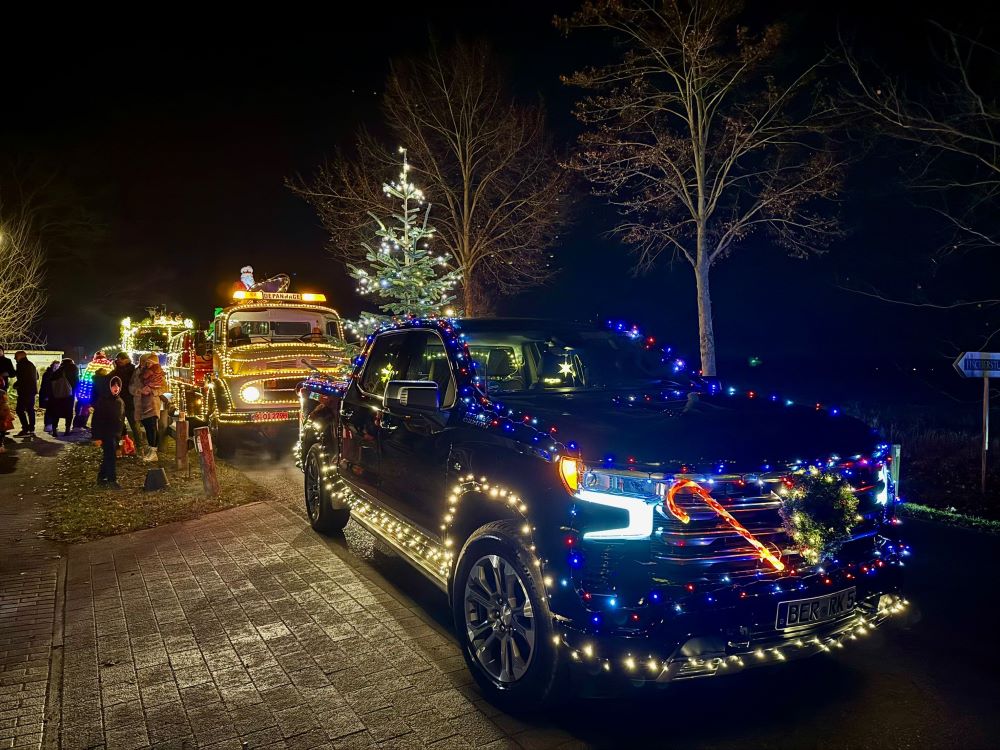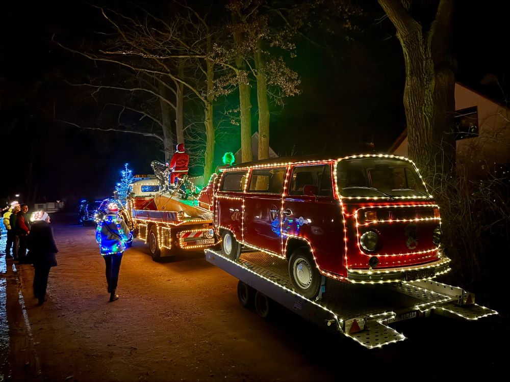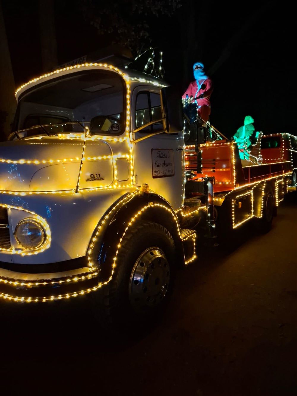 Mit dabei wunderbar ausgestaltete, funkelnde, private Auto, Motoräder und Fahrzeuge der historischen Feuerwehrtruppe und vor allem Traktoren, die von glitzernden Weihnachtsmännern und schillernden Himmelswesen gelenkt und begleitet wurden. Auch ein historischer Trecker ist geschmückt und tuckert im langsamen Tempo mit.