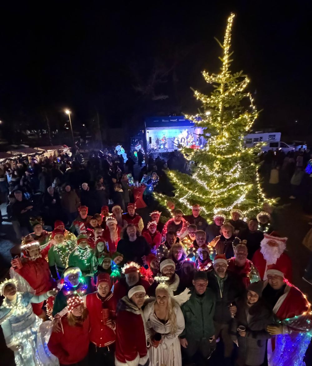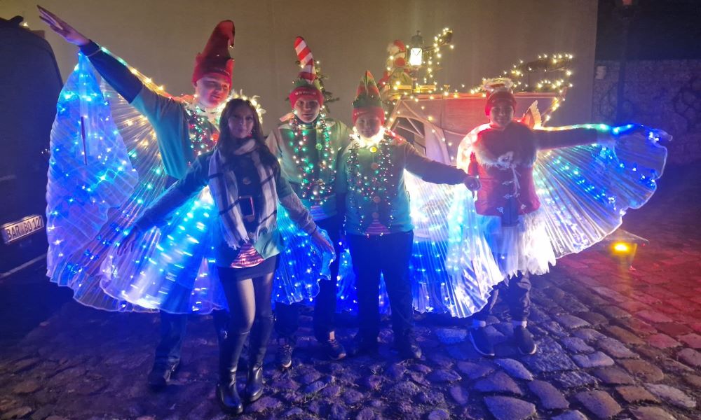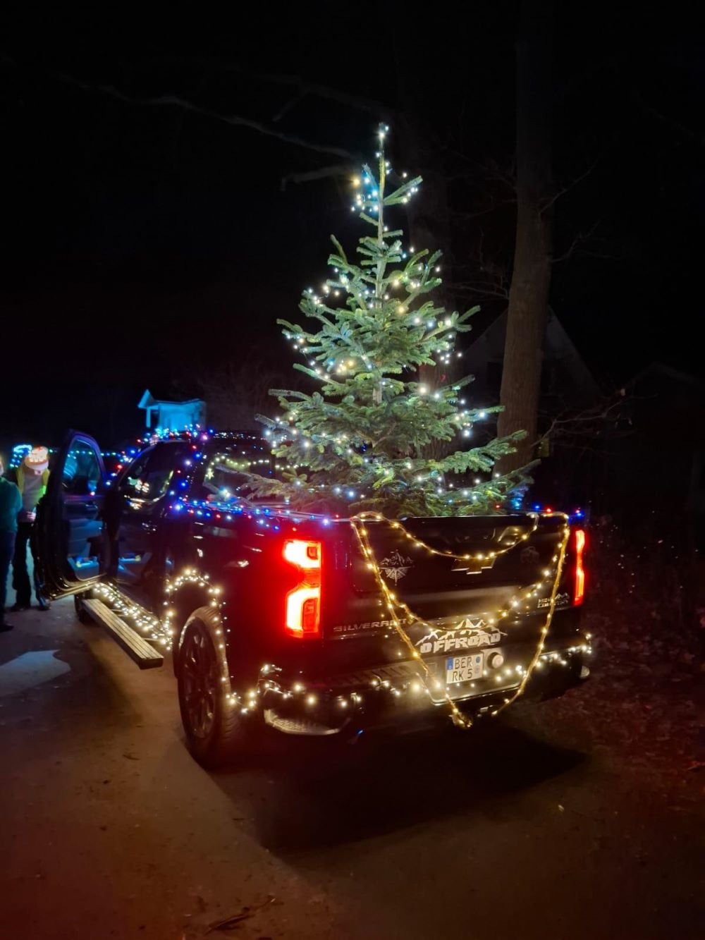 Mit dabei wunderbar ausgestaltete, funkelnde, private Auto, Motoräder und Fahrzeuge der historischen Feuerwehrtruppe und vor allem Traktoren, die von glitzernden Weihnachtsmännern und schillernden Himmelswesen gelenkt und begleitet wurden. Auch ein historischer Trecker ist geschmückt und tuckert im langsamen Tempo mit.