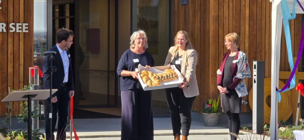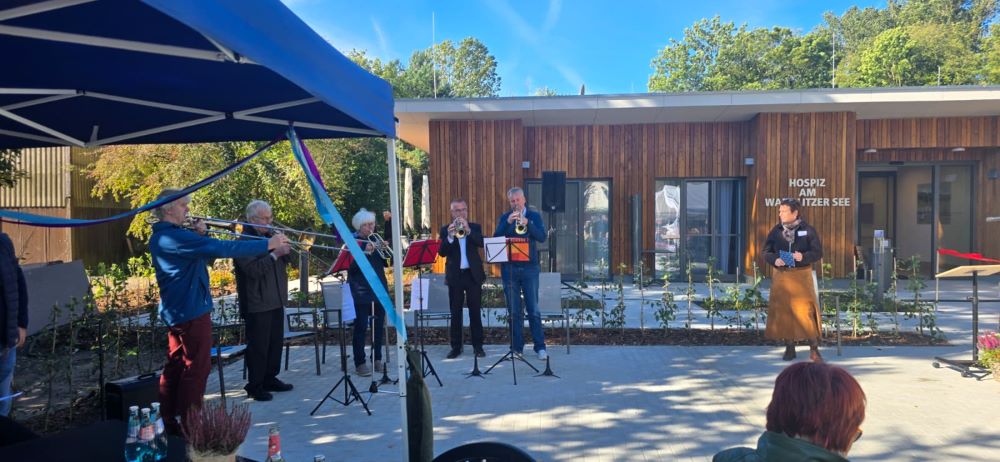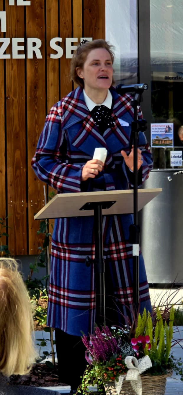 Fritzi Haberlandt, Schirmherrin vom Hospiz am Wandlitzer See, ist absolut begeistert von diesem schönen Ort und nimmt mit ihrer emotionalen Ansprache alle Gäste mit. Sie selbst ist seit 6 Jahren ehrenamtlich im Lazarus Hospiz in Berlin tätig. Aus eigener Erfahrung kennt sie diesen Ort der Menschlichkeit und Fürsorge, der für alle offen ist. Sie hat gelernt, dass hier gelebt und gestorben, gelacht und geweint, gekocht und gefeiert wird. Dank geht an die zukünftigen Mitarbeiter:innen, die dunkle Stunden werden heller lassen.