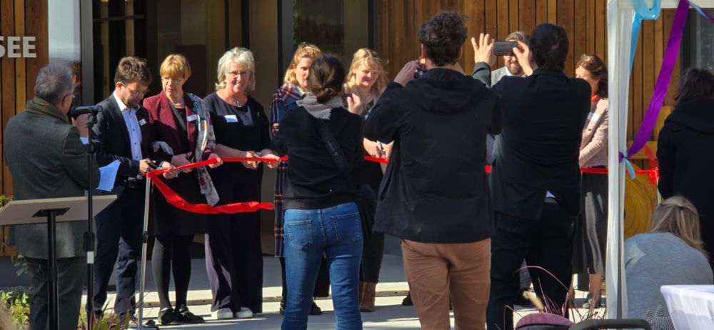 Katja Möhlhenrich-Krüger, Leitung Altenhilfe, übergibt den Schlüssel für das Hospiz an Annette Adam, die das Hospiz leiten wird und an die Pflegedienstleitung Merle Weiden, die bereits jetzt schon eine große Erfahrung in der palliativen Pflege und der Leitung mitbringt. Sie durchtrennen gemeinsam mit allen vorgenannten das rote Band.