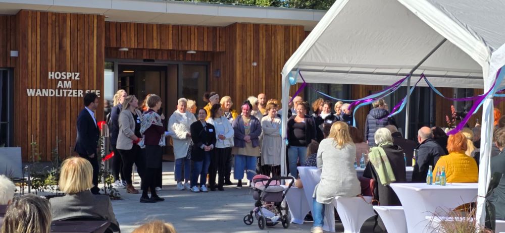 Der erste Spatenstich zum Hospiz am Wandlitzer See erfolgte bereits im Juli 2023, nur ein Jahr später dann das Richtfest und nach einem weiteren Jahr lud die Hoffnungstaler Stiftung Lobetal am 25. September 2025 zur feierlichen Einweihung ein. Bei stürmischen Winden, unter rauschenden hohen Bäumen waren sehr viele Besucher:innen gekommen. Durch die Einweihung führte Herr Kern, der Pressesprecher der Stiftung Lobetal. Geschäftsführerin Jeanette Pella begrüßte die Anwesenden und dankte den Aktiven, u.a. dem Architekturbüro, dem Förderverein Lobetal und dem ehemaligen Geschäftsführer Martin Wulff für die geleistete Arbeit und Unterstützung.