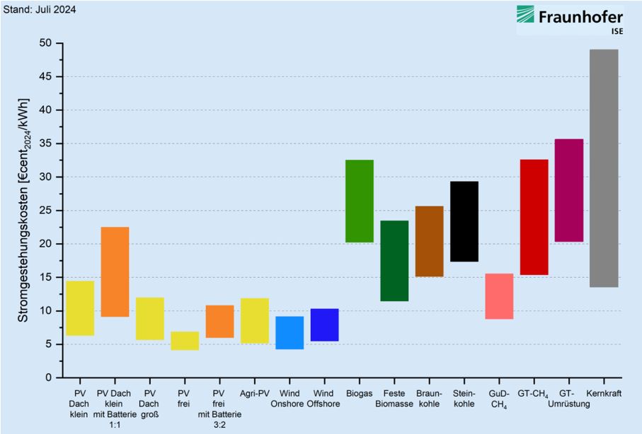 Um mehr grünen Strom zu erzeugen, brauchen wir den weiteren Ausbau von Windkraft und PV- Anlagen. Große Flächen-PV und Windkraft an Land sind die aktuell preiswertesten Arten der Stromerzeugung!